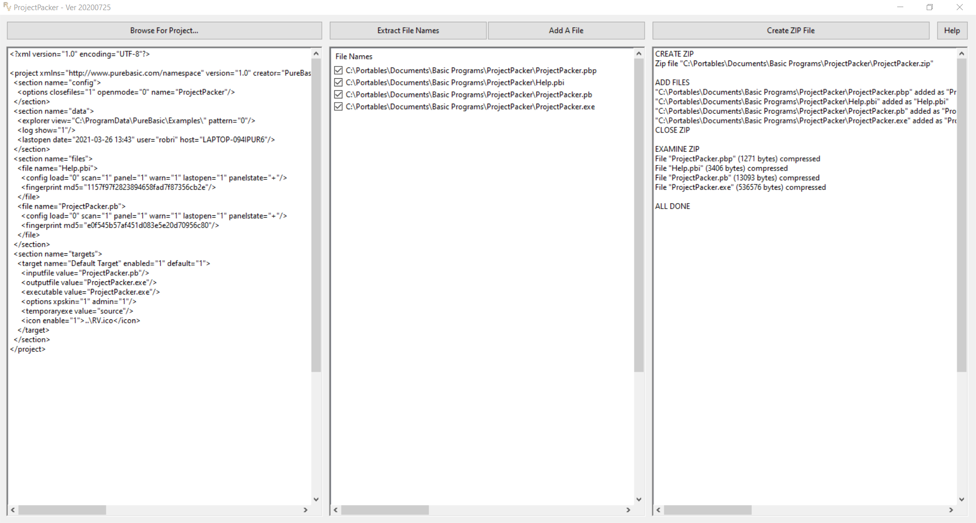 ProjectPacker allows you to read a PureBasic project file (*.pbp), extract from it the names of source and output files,